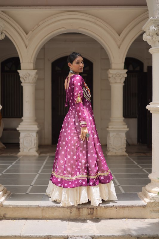 • Womenline Purple Color Bandhani Print Kurti With Kora Cotton Lehenga
