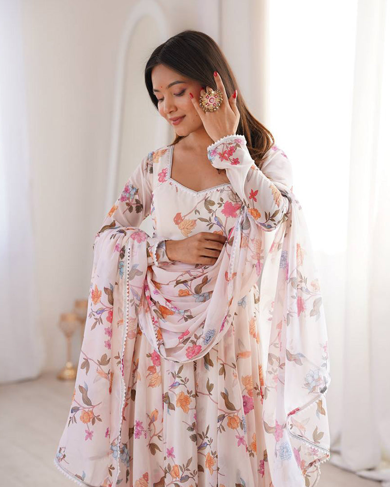 An elegant white georgette three-piece Anarkali suit designed with a flowing silhouette and refined detailing. Crafted from lightweight fabric for effortless grace, this ensemble is perfect for festive occasions, celebrations, and sophisticated daytime events.