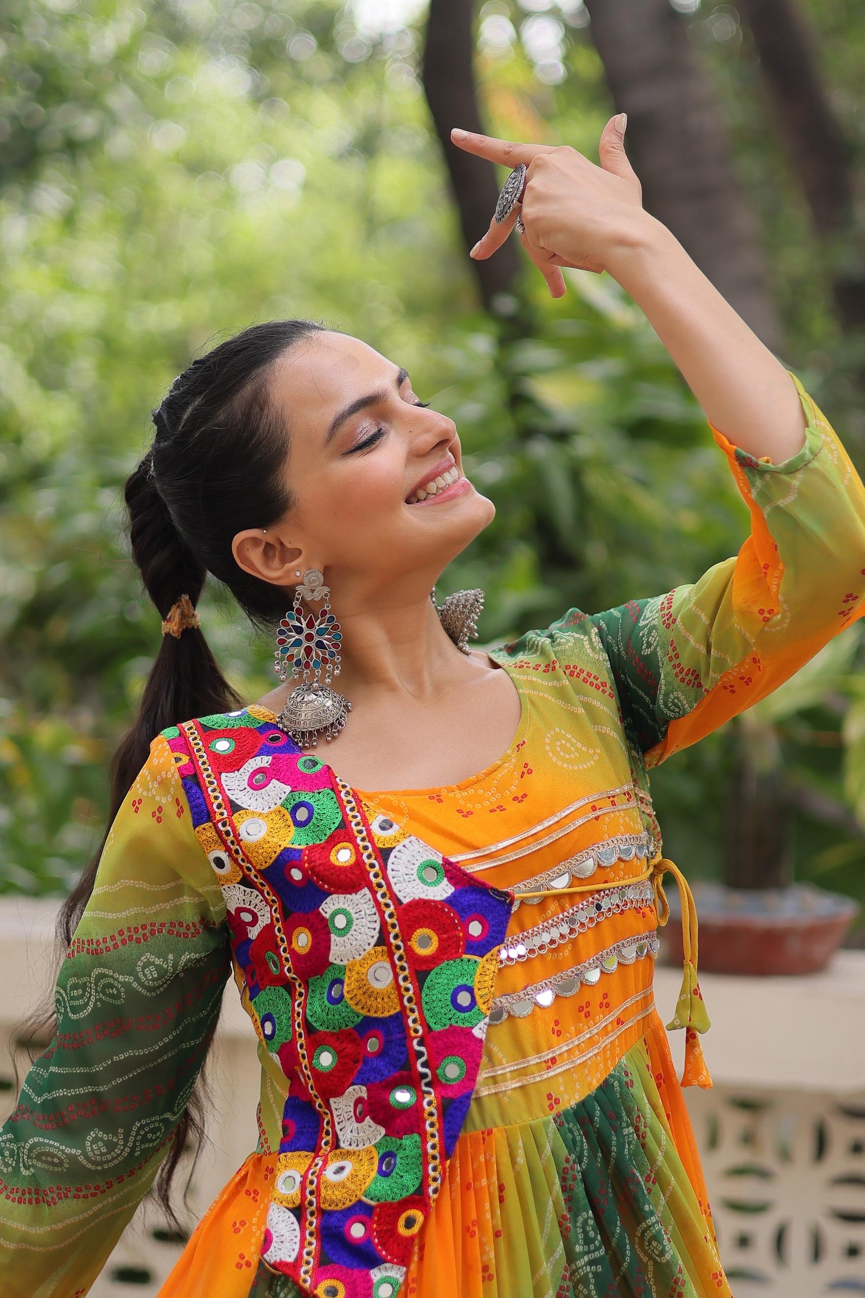 Fabrics & Work :- Laheriya & Bandhej Print with kutchi patche work in Faux Georgette.